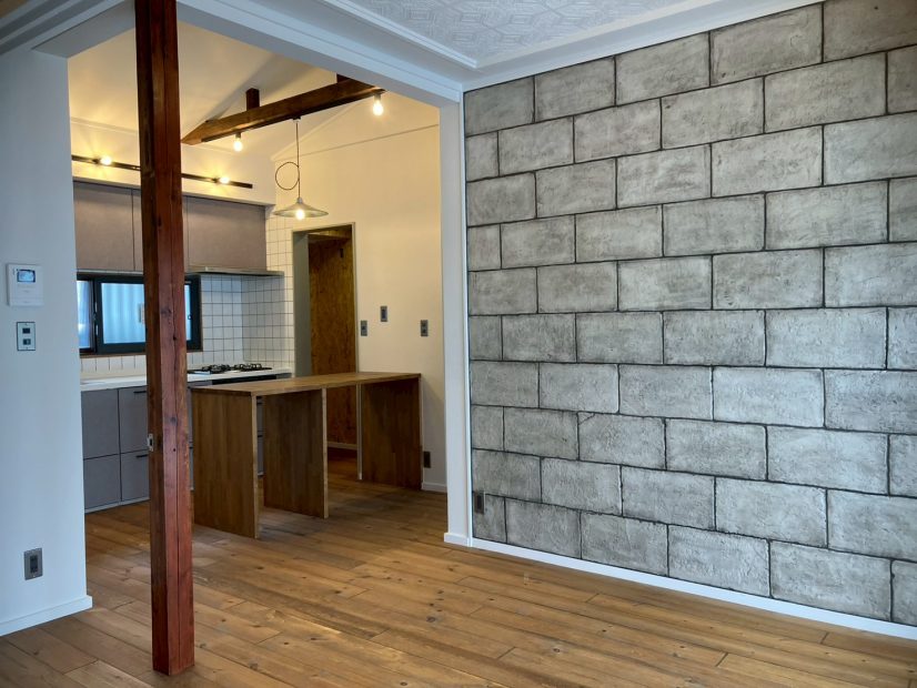 石張り風のデザインコンクリートが良いアクセントのLDK